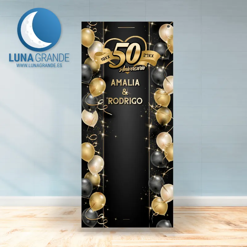 Haz que tu aniversario sea un evento inolvidable con este Cartel de Bienvenida para Aniversarios. Diseñado en tonos dorados, este banner se presente en formato lona o Xbanner en 80 x 180 cm o 60 x 160 cm y en formato Rollup (enrollable) de 85 x 200 cm está impreso en lona de alta calidad fotográfica, garantizando colores vivos y duraderos.