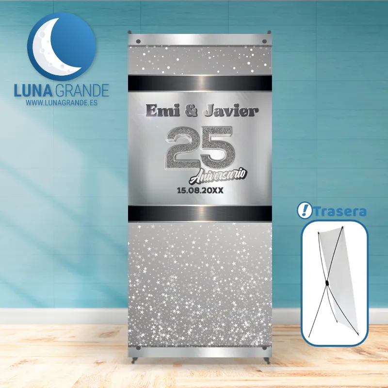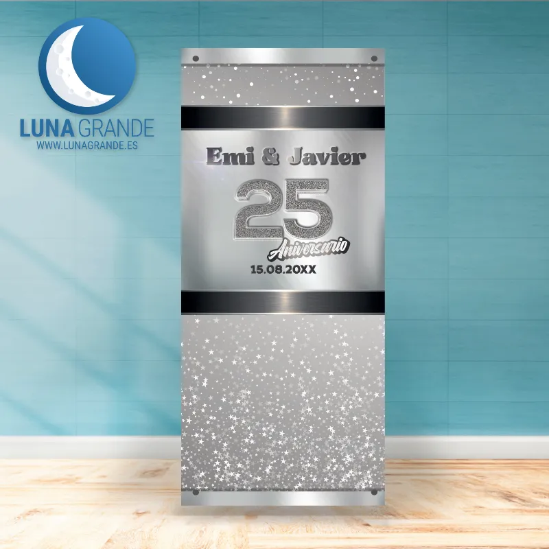 Haz que tu aniversario sea un evento inolvidable con este Cartel de Bienvenida para Aniversarios. Diseñado en tonos plateados, este banner mide 80 x 180 cm o 60 x 160 cm y está impreso en lona de alta calidad fotográfica, garantizando colores vivos y duraderos.