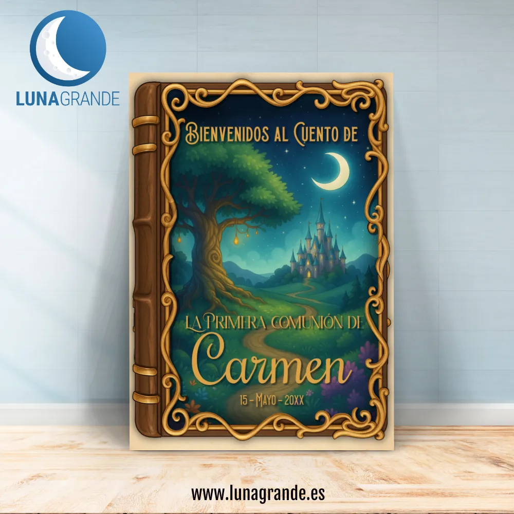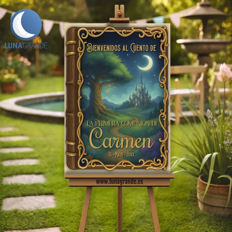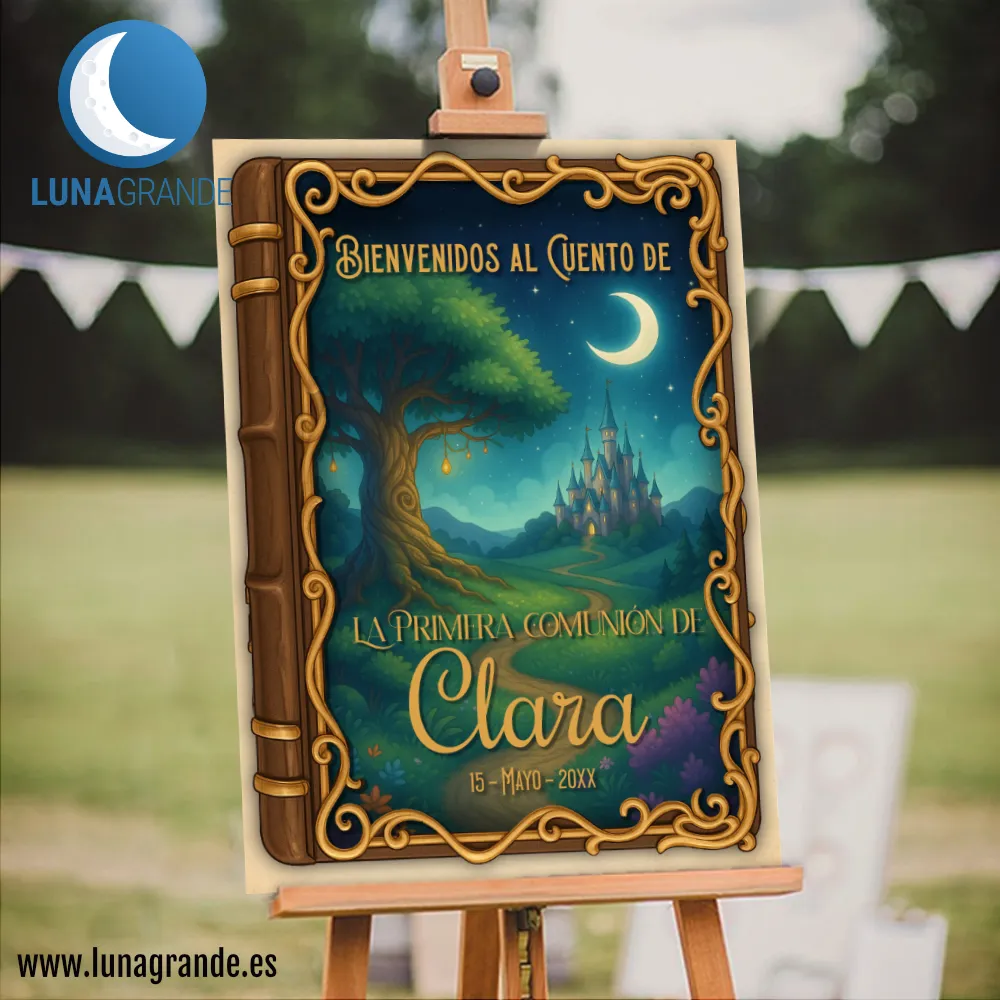 Crea una entrada mágica e inolvidable al evento con nuestro exclusivo Cartel de Bienvenida con diseño de la portada de un libro de cuentos. Este cartel no es solo una señal; es la primera página de una historia encantada que comienza el día especial de tu hijo/a.