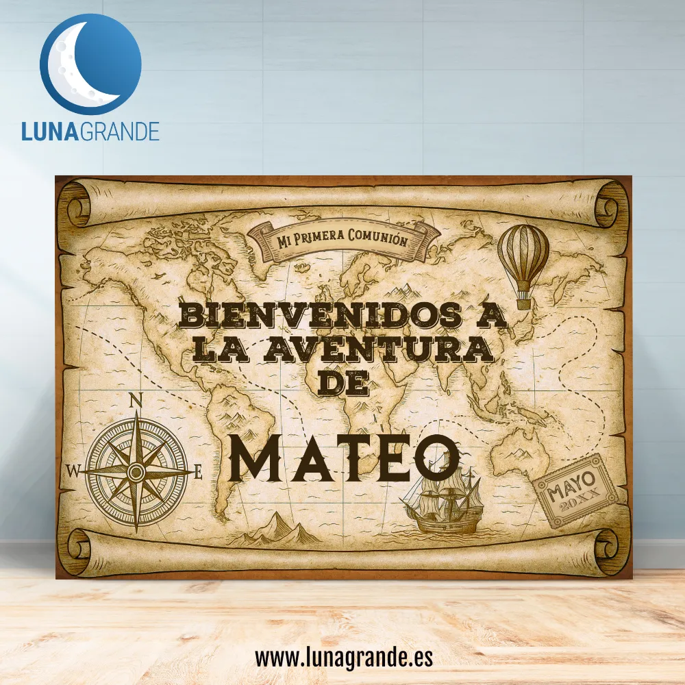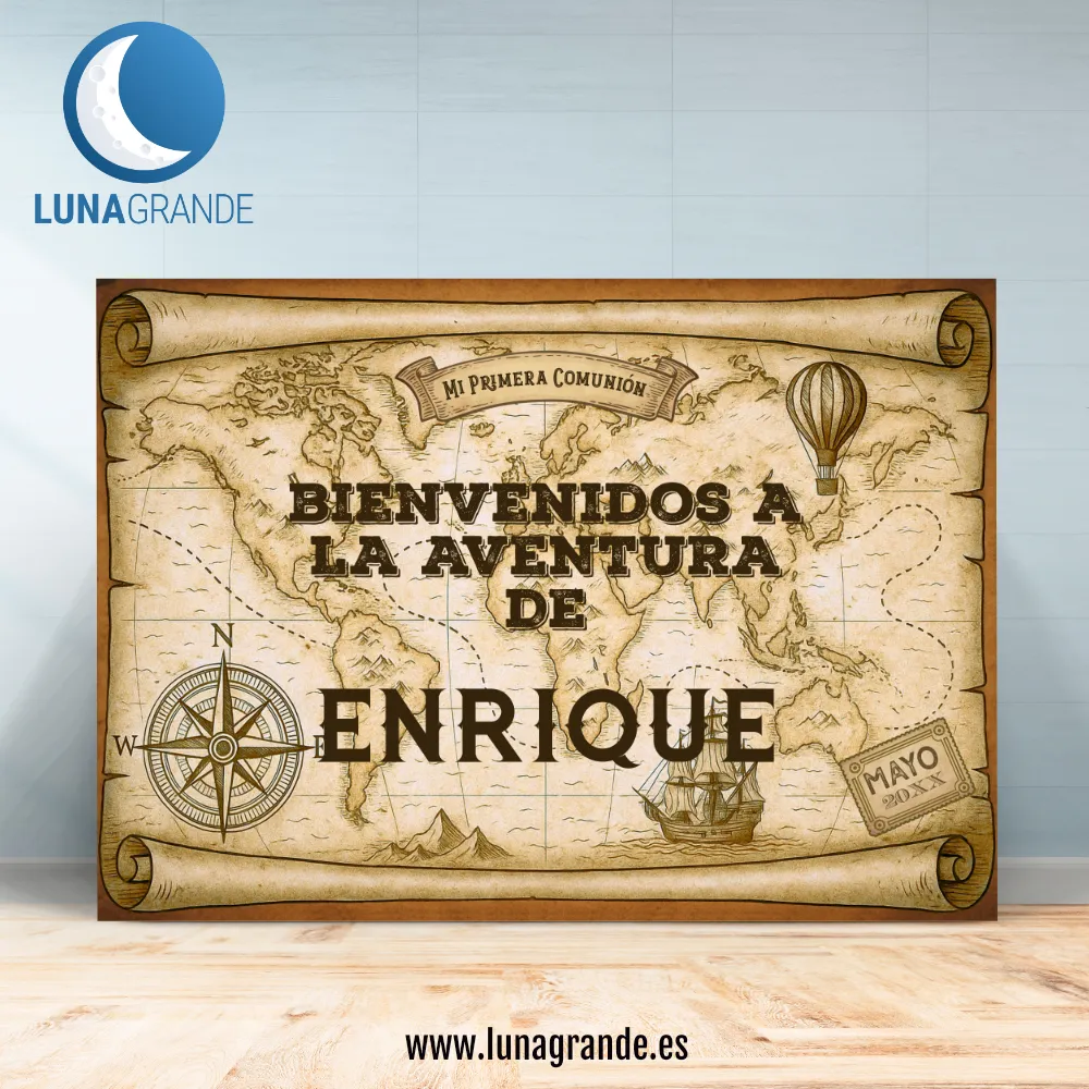 Transforma la comunión de tu hijo en una auténtica aventura con nuestro cartel de bienvenida estilo mapa antiguo.
