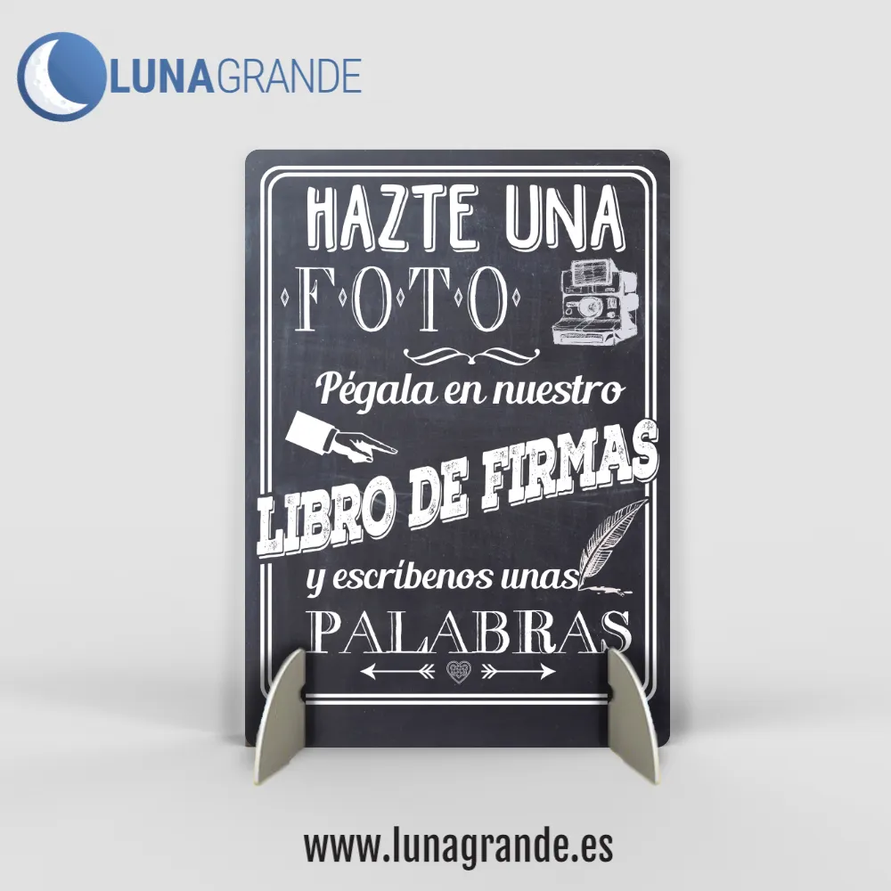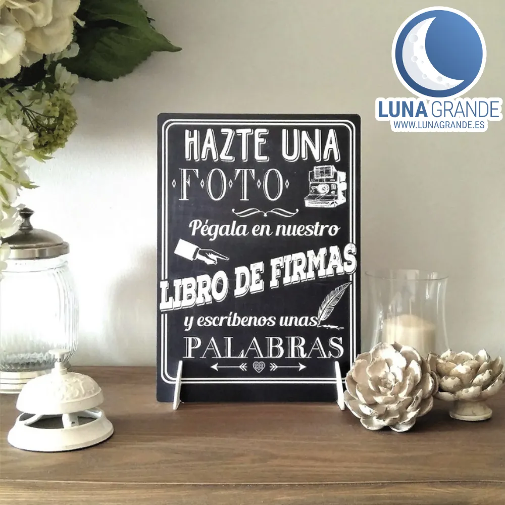 Este Cartel de sobremesa está pensado para que lo coloques en la mesa del Photocall de tu boda, fiesta de cumpleaños, comunión etc…. está impreso en calidad fotográfica, su diseño imita una pizarra escrita con tiza, con el mensaje: