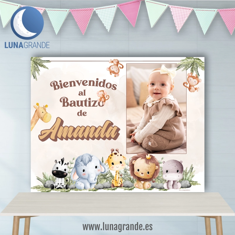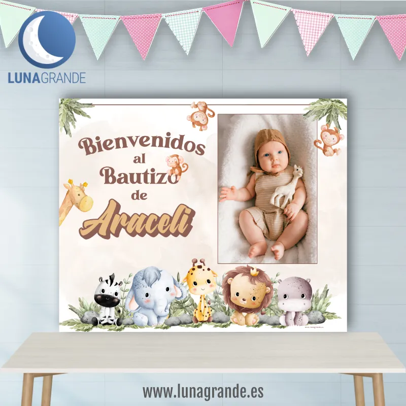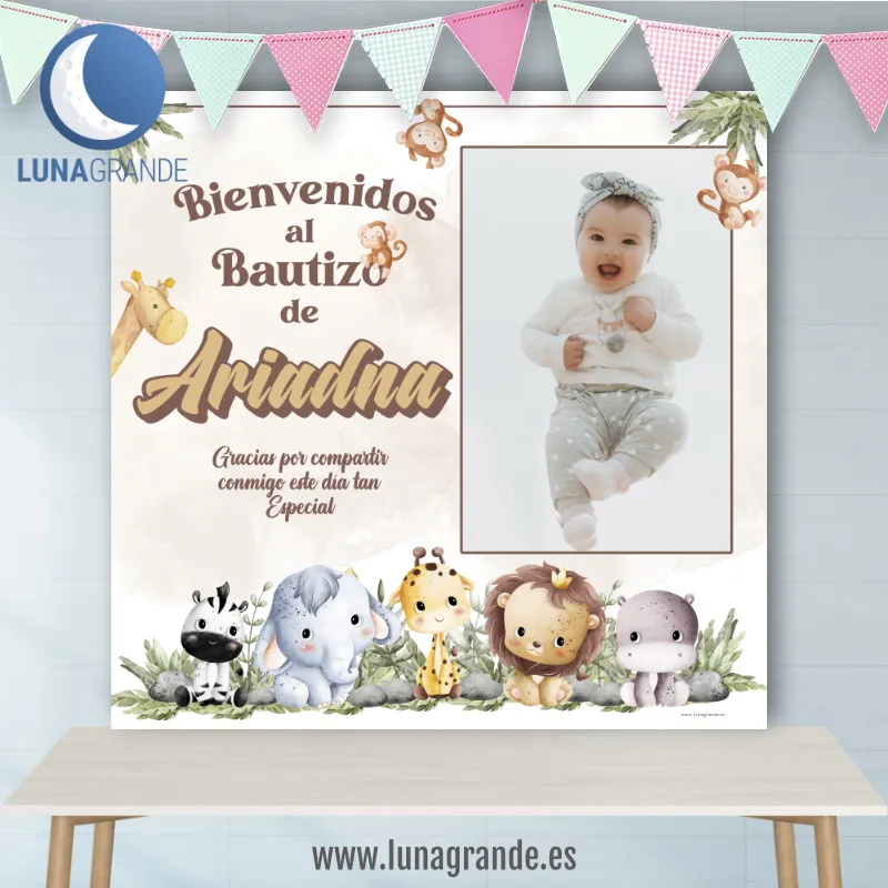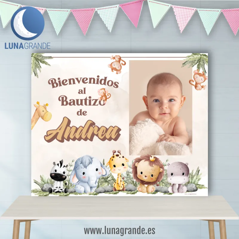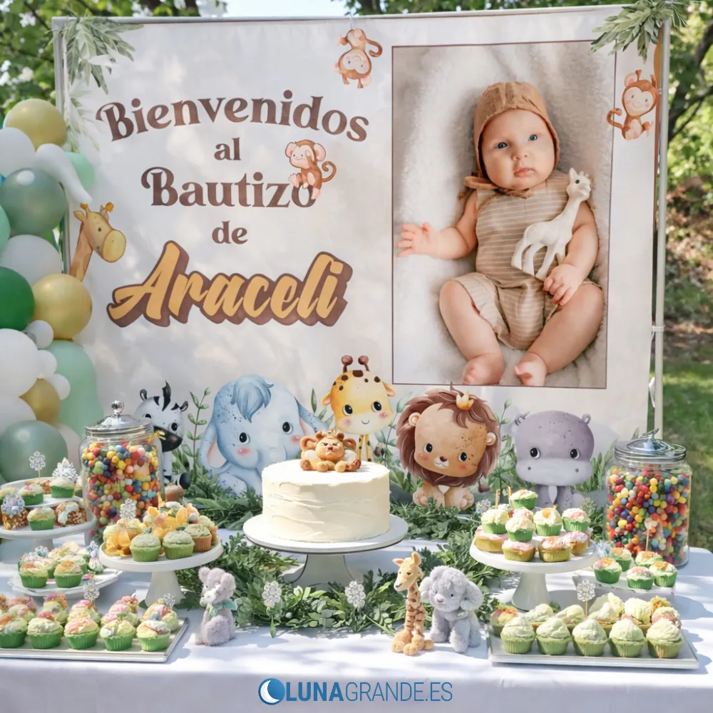 Si quieres una decoración tierna, original y muy fácil de reconocer en fotos, este Fondo para Mesa Dulce de Bautizo Selva es una apuesta muy buena. El diseño combina una composición suave en tonos neutros con animalitos de la selva, espacio para la foto del bebé y personalización con nombre, fecha y texto del evento.