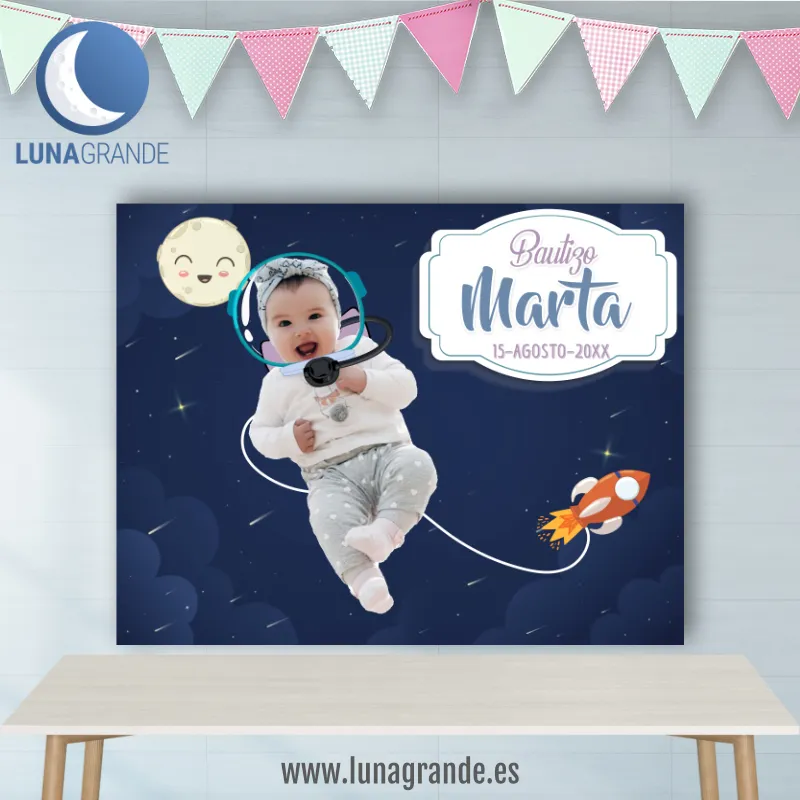 Completa la decoración de la Fiesta del Bautizo o Cumpleaños de tu hijo/hija con este Fondo para la mesa de dulces – Candy Bar con un diseño de lo más original con la foto de el o la protagonista caracterizada de astronauta en el espacio sideral, además está totalmente personalizado con el nombre del o la protagonista.