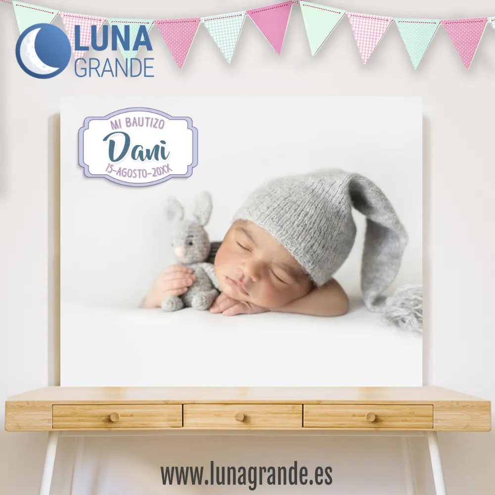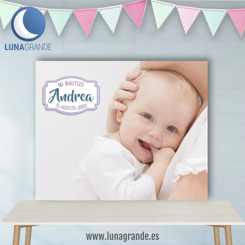 Dale un toque especial y entrañable a la decoración de la celebración del Bautizo de tu hijo/a con este fondo para Candy Bar – mesa de dulces del convite totalmente personalizado con la fotografía y el nombre del, la o las protagonistas y la fecha del Bautizo.