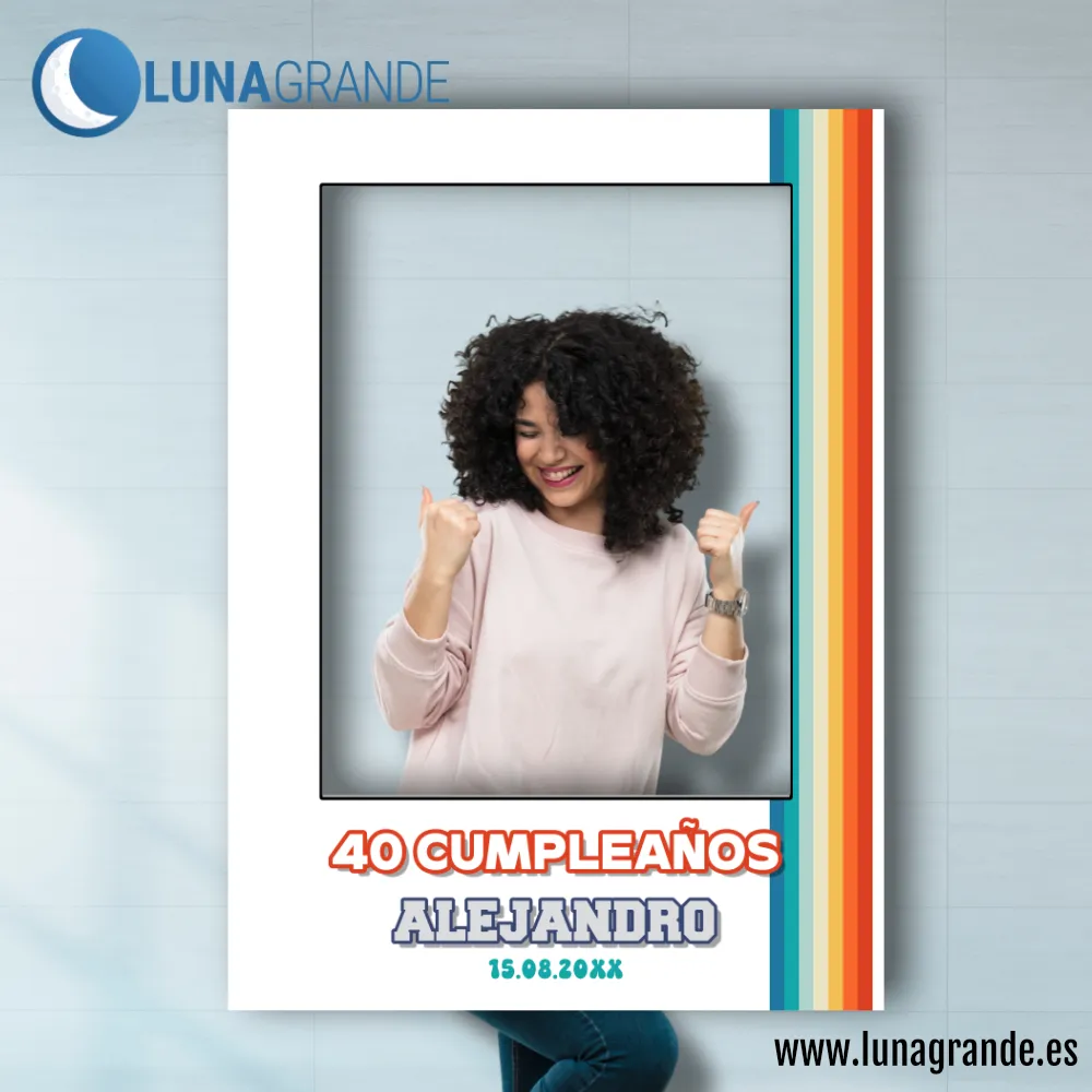 Este Marco Photocall Polaroid Fiesta con un diseños simple y elegante en tonos pastel con un aire ochentero, es ideal para el Photocall de tu boda, con nuestro diseño «retro», actualiza y mejora la típica foto polaroid y se personaliza en la parte inferior con los nombres de la pareja, del cumpleañero, del homenajeado… etc. y la fecha y algún hashtag e impreso por una sola cara a todo color en calidad fotográfica HD.