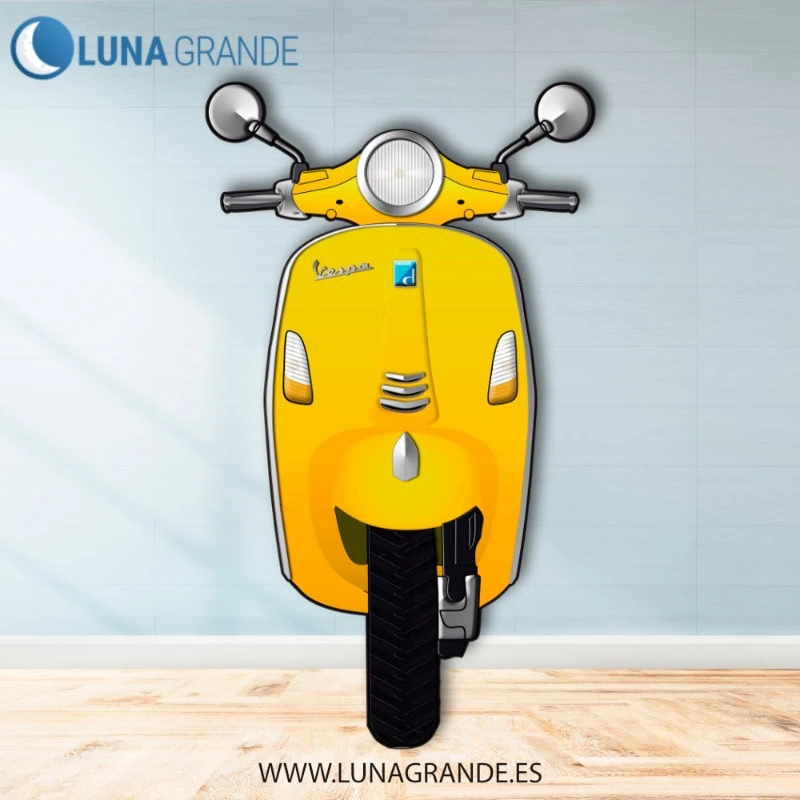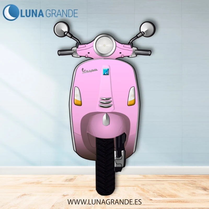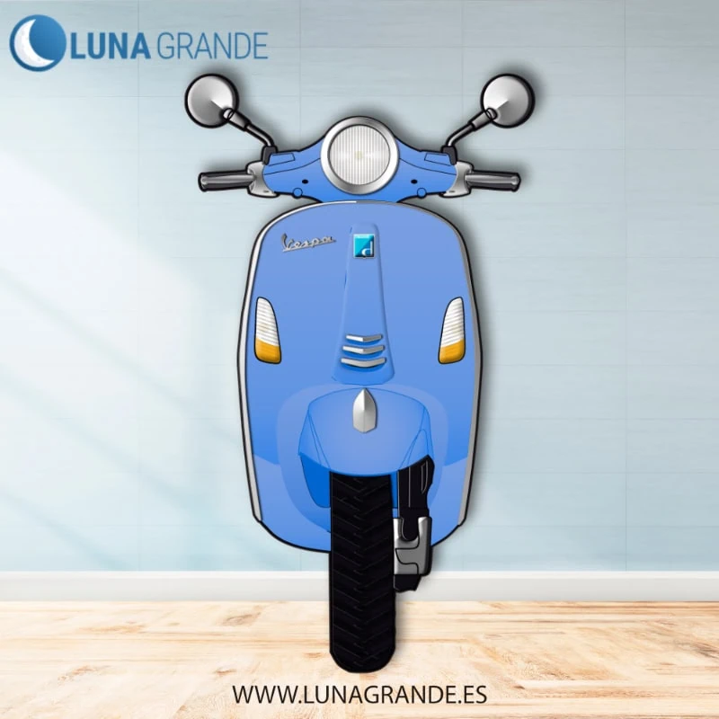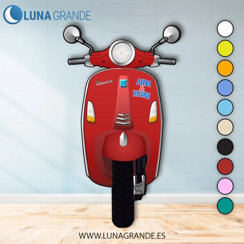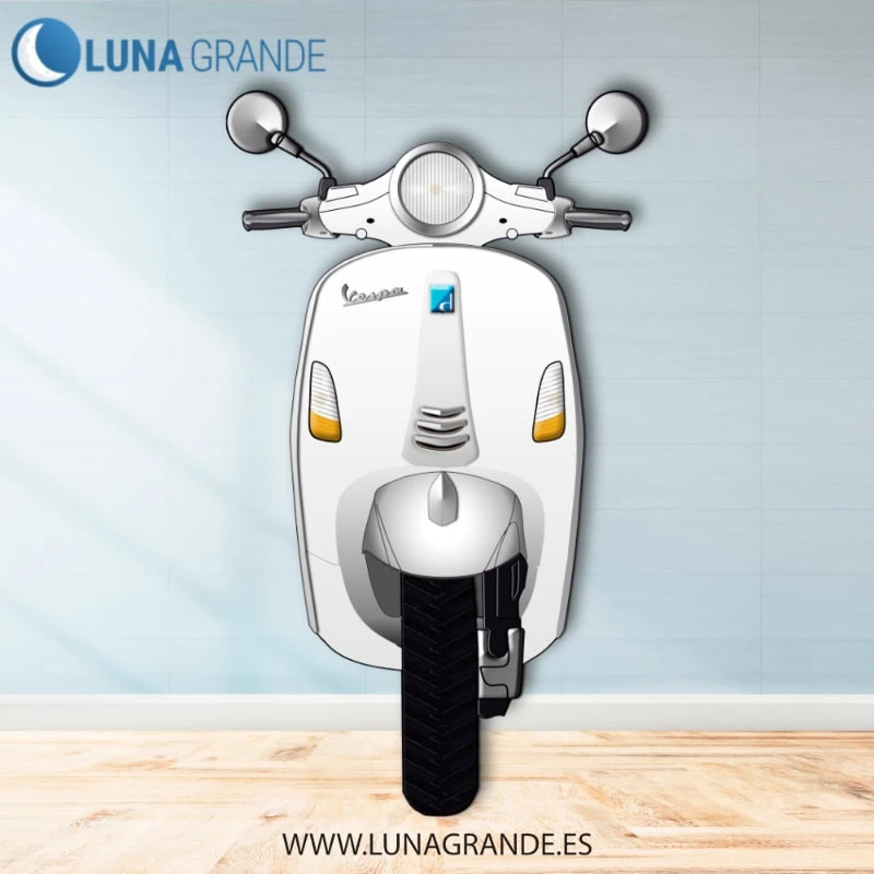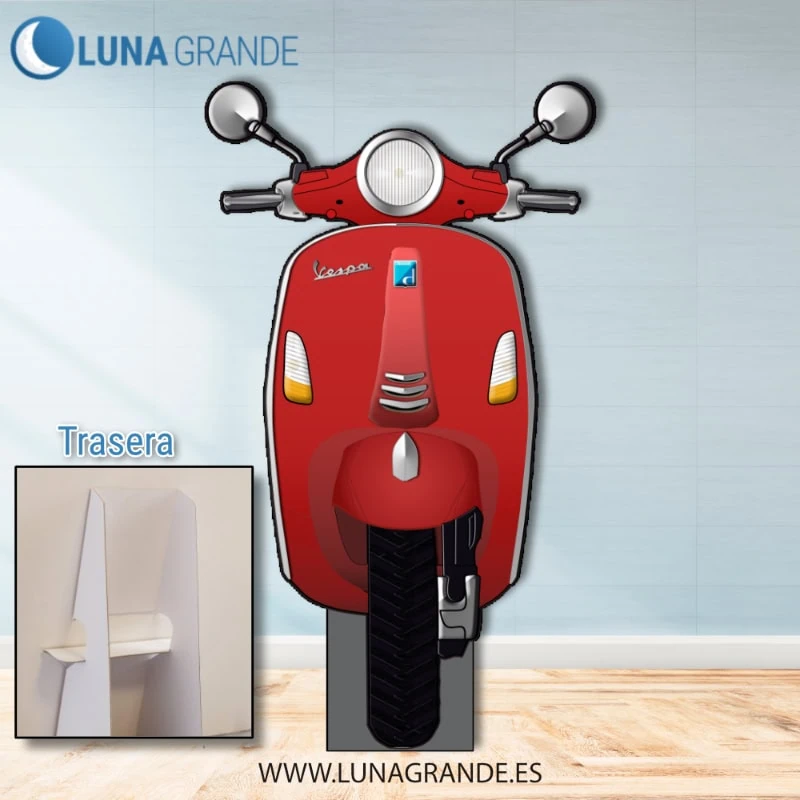 Este producto es un photocall con forma de moto scooter inspirado en el diseño clásico italiano tipo Vespa. Se utiliza en eventos como bodas, cumpleaños o celebraciones temáticas para crear fotos divertidas y memorables. Está disponible en diferentes materiales y acabados, con opción de personalización.