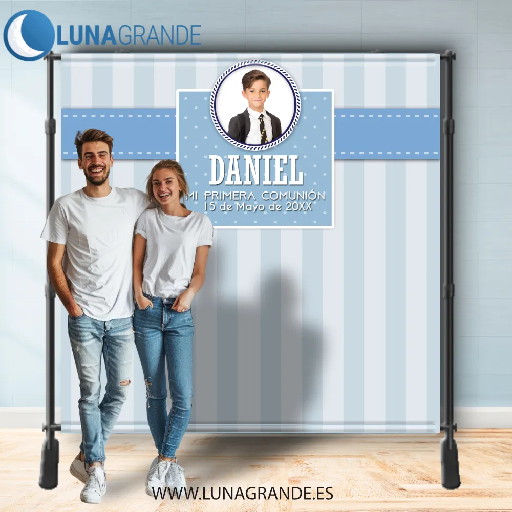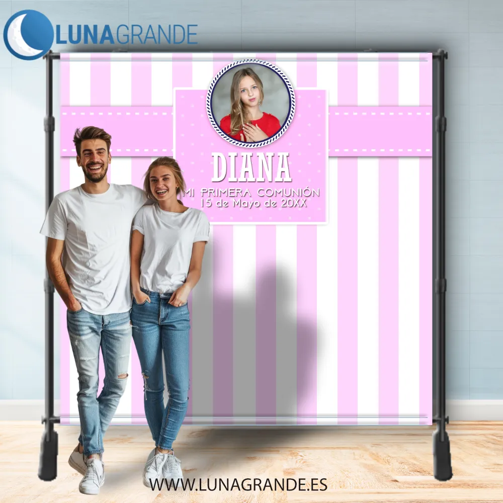 Se trata de un fondo de líneas verticales gruesas sobre un fondo color rosa o celeste (o el color que quieras) personalizado con el nombre del o la protagonista y la fecha de la primera comunión en una banda en la parte superior que acompañan a una foto circular del niño o la niña enmarcada en un rectángulo con lunares.