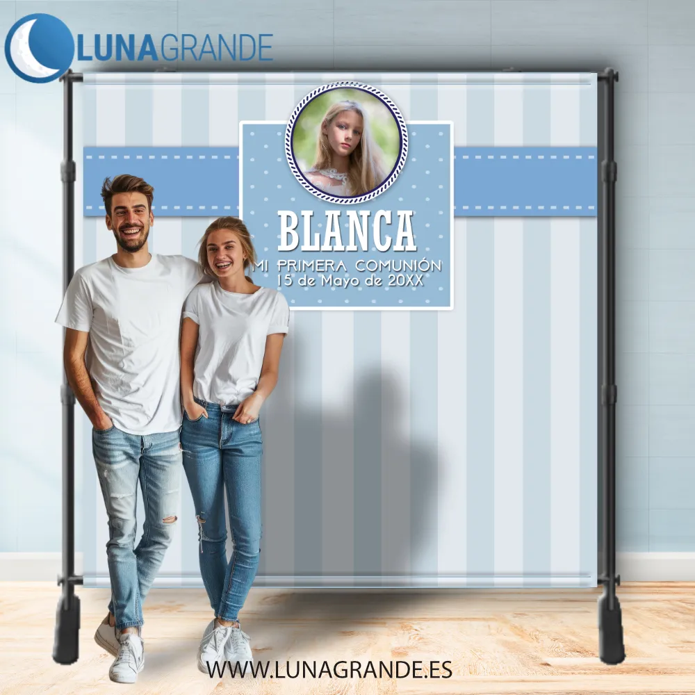 Este tu photocall de Primera Comunión si no quieres complicarte mucho, es más sencillo y versátil, ya que se trata de una lona de alta calidad y gran durabilidad impresa a todo color por una cara con calidad fotográfica.